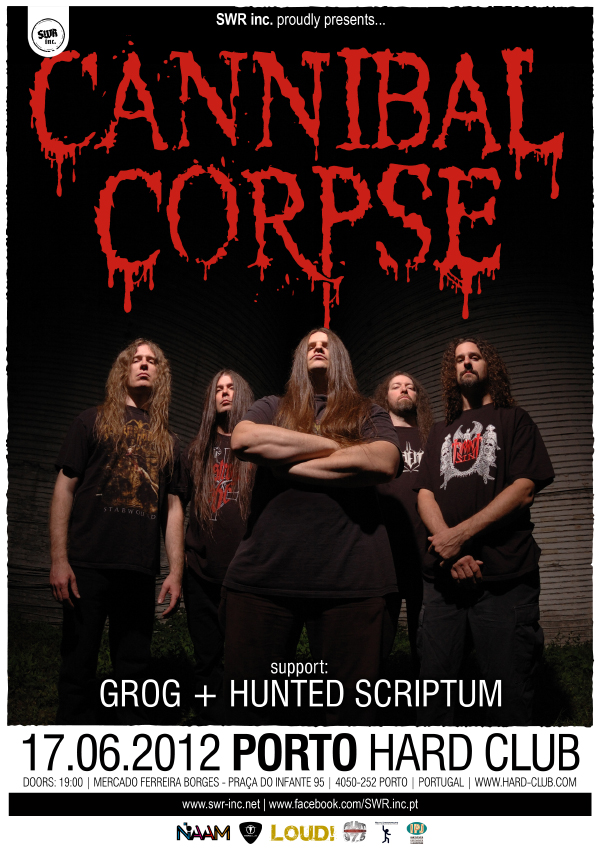 O death metal dos norte-americanos Cannibal Corpse encabeça claramente o primeiro dia do SWR PORTO HARD 2012. A influente banda de Alex Webster, Pat O’Brien, Paul Mazurkiewicz, Rob Barrett e George “Corpsegrinder” Fisher desloca-se ao nosso país para a apresentação em primeira mão de Torture, este que é já o seu 12.º registo discográfico e uma prova de que o grupo se encontra cada vez mais forte. Os portugueses Grog e Hunted Scriptum encarregam-se da abertura de uma noite dedicada ao death metal na sua vertente mais brutal.